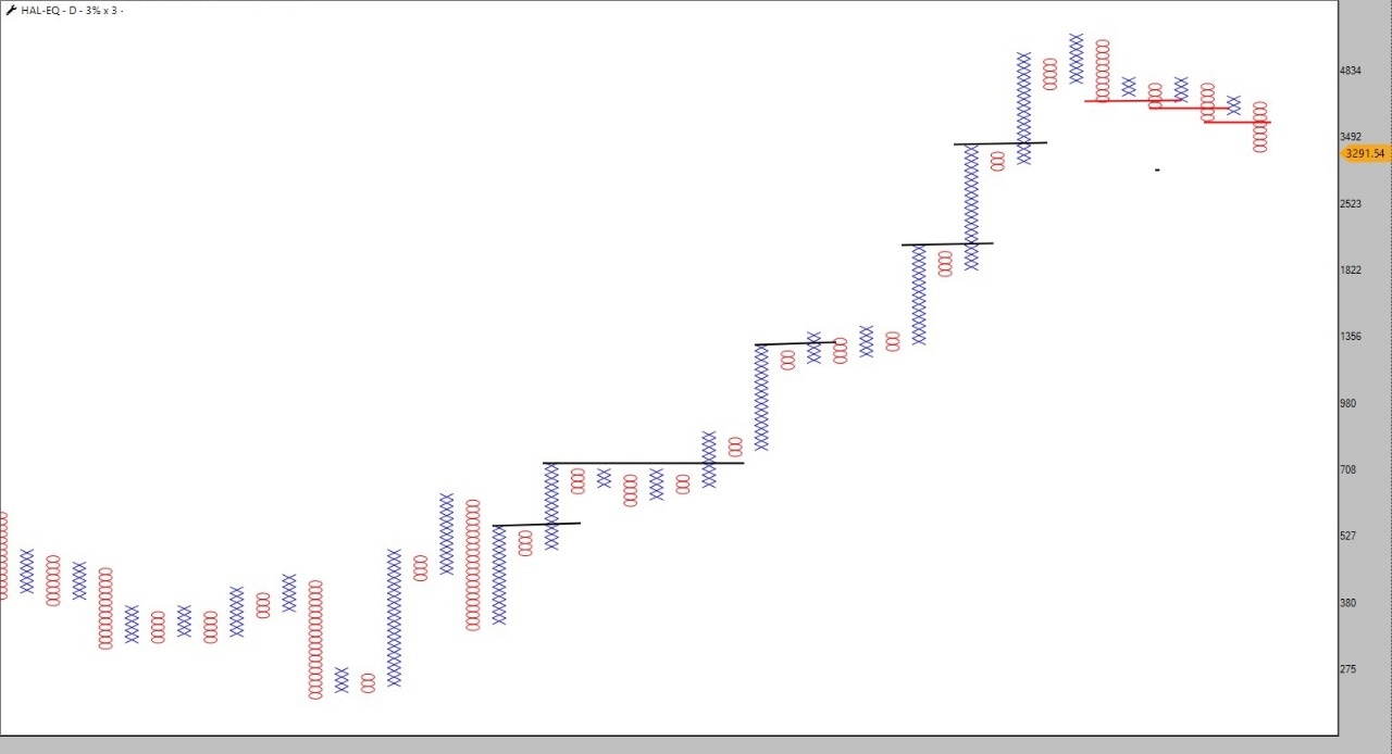 When analysing HAL’s stock price movements, we can observe that the stock underwent a bullish phase during the past few years. Using a 3% X 3 Daily Point & Figure (P&F) Chart, we can see that the stock price experienced a series of bullish anchor columns, a pattern of a strong bullish trend.