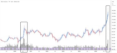 What strengthens this observation is the spike in trading volumes. The last two weekly candles recorded the highest volume since 2020, the same period when Silver hit Rs. 1,15,176 and then sharply corrected to Rs . 76,568. Historically, such volume surges near highs often mark inflexion zones where big hands are active, either accumulating or distributing.