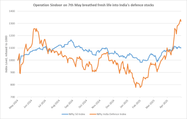 In the last one year, Nifty India Defence Index has appreciated by 32%, head and shoulders above the 10% return delivered by the broad market index. But it is important to note that until 6th May 2025, the defence sector was lagging with 6% return versus the 8% return delivered by Nifty 50 index. It is only after Operation Sindoor that the defence index spiked up sharply.