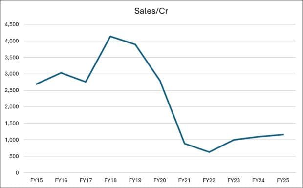 The sales for Prakash Industries have grown at a compound rate of a mere 6% from Rs 2,974 cr in FY 20 to Rs 4,014 cr in FY25.
