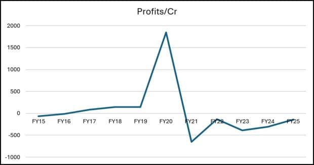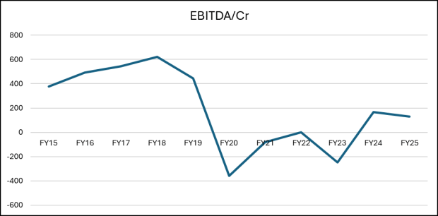 The EBITDA (earnings before interest, taxes, depreciation, and amortization) has climbed from Rs 350 cr in FY20 to Rs 520 cr in FY25. That is a compounded growth of 8%.