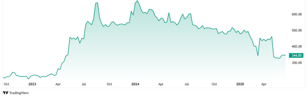 At the current price of Rs 342, the company’s share is trading at a discount of 46% from its all-time high of Rs 637.