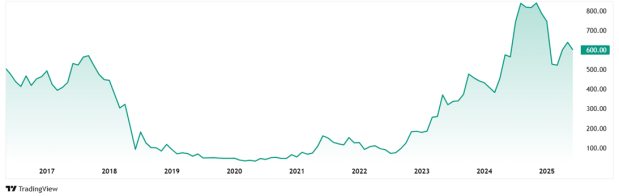These turnaround figures helped the share prices of Arrow Greentech, which was around Rs 48 in June 2020 and over the last 5 years grew to its current price of Rs 600 (as on 16th June 2025). This is a jump of 1,150%.