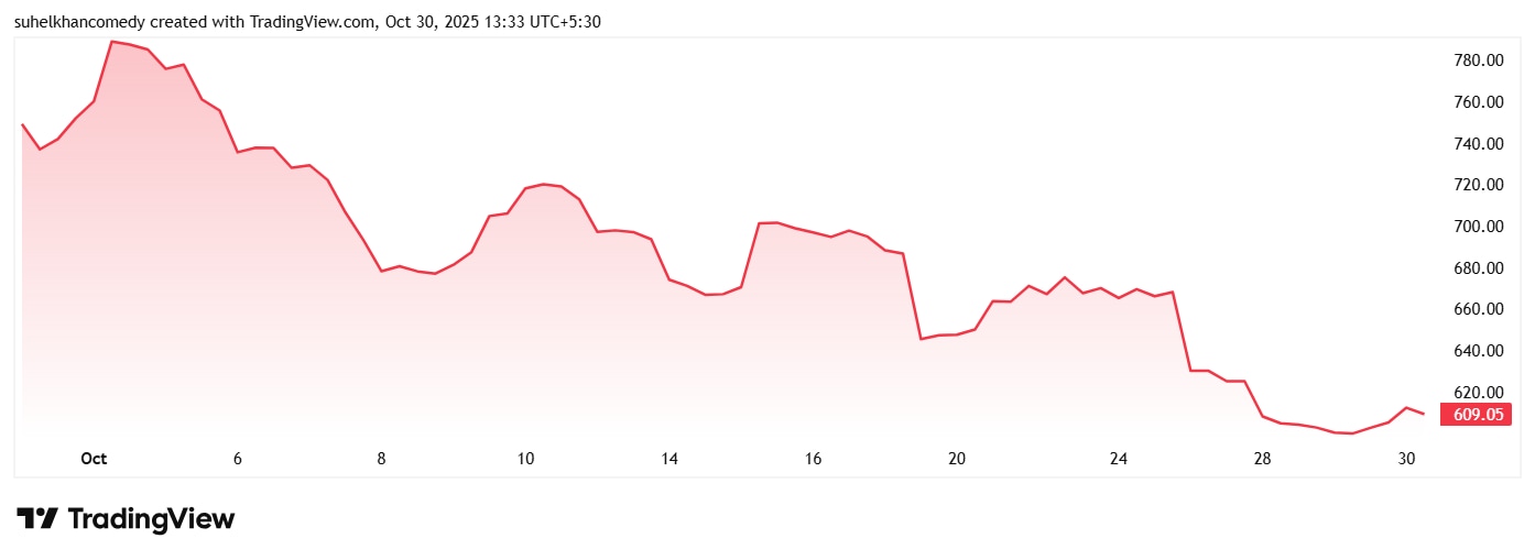 The share price of Jaro Institute of Technology Management and Research Ltd at listing in September 2025 was Rs 745 and as on 30th October 2025 it was Rs 608. The current price is a discount of 32% from its all-time high price of Rs 890.