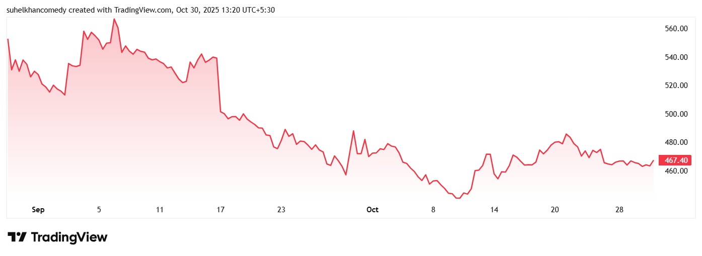 The share price of Mangal Electrical Industries Ltd was around Rs 535 when it was recently listed in August 2025 and as on 30th October 2025, the price was Rs 468. This current price is a discount of around 19% from the all-time high of Rs 574.