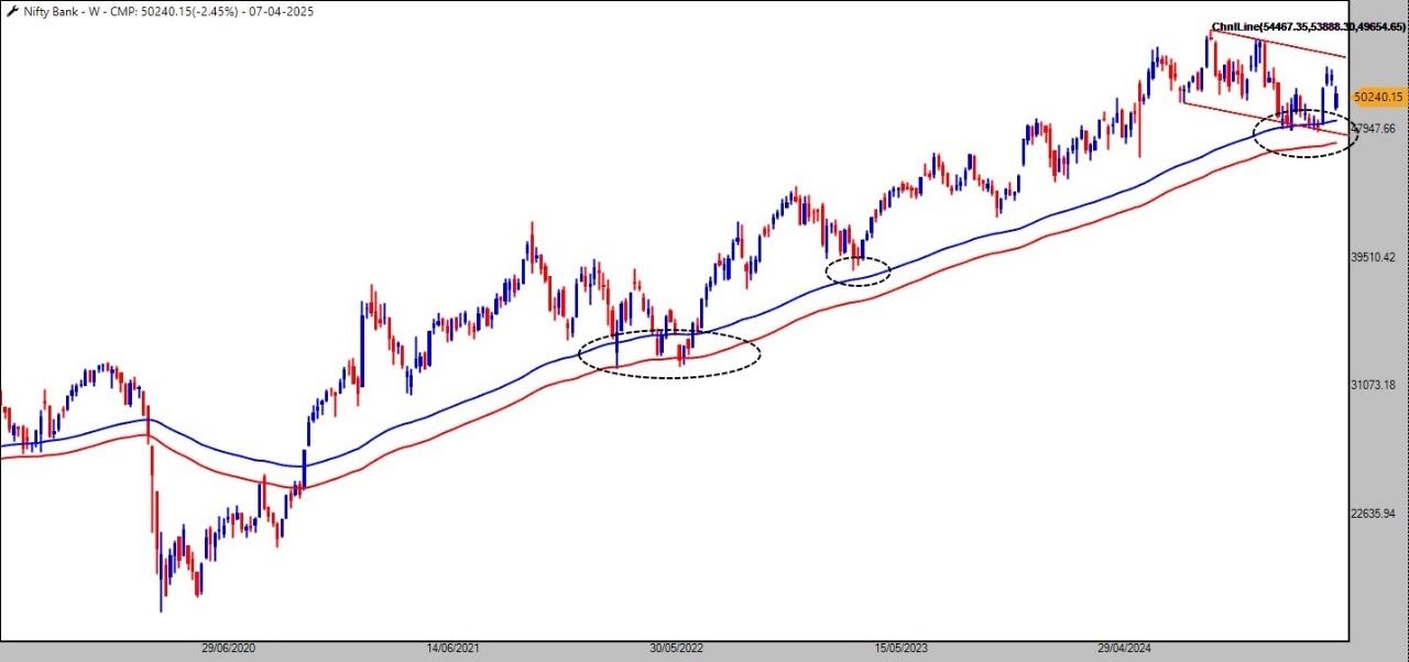 The weekly chart of the Bank Nifty signals bulls are in control of the trend. Dips have consistently been met with buying interest, indicating strong underlying demand. The bulls have strategically utilised the Moving Average Channel, specifically the 100WEMA Channel, which has acted as a significant demand zone since 2020.