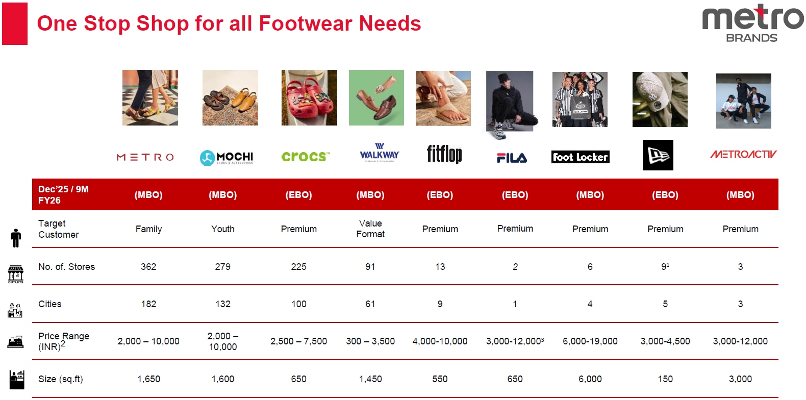 Metro owns and operates several popular footwear brands, including Metro, Mochi, Walkway, Da Vinci, J Fontini, Princess, and Haute Diva. These brands are highly successful, contributing to roughly 70-75% of the total product sales at their Multi-Brand Outlets (MBOs).