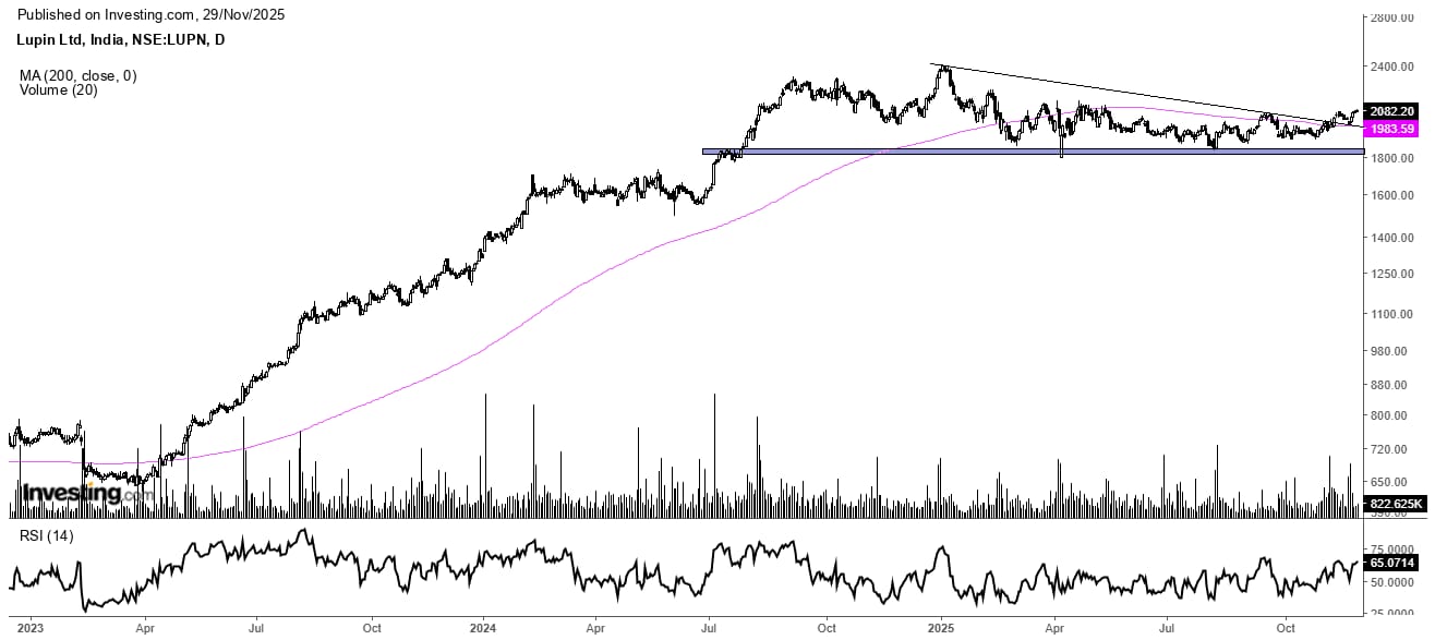 Lupin rallied from ₹630 to ₹2400 between March 2023 and January 2025 before entering a consolidation phase, correcting about 26%. At the current juncture, the stock has broken out from a bullish reversal pattern, a descending triangle.