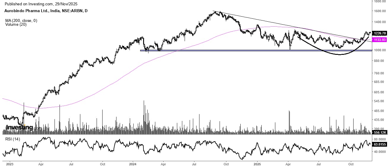 Aurobindo Pharma (Auropharma) began its rally in early 2023 from ₹390, delivering 298% returns in two years and hitting an all-time high of ₹1580.