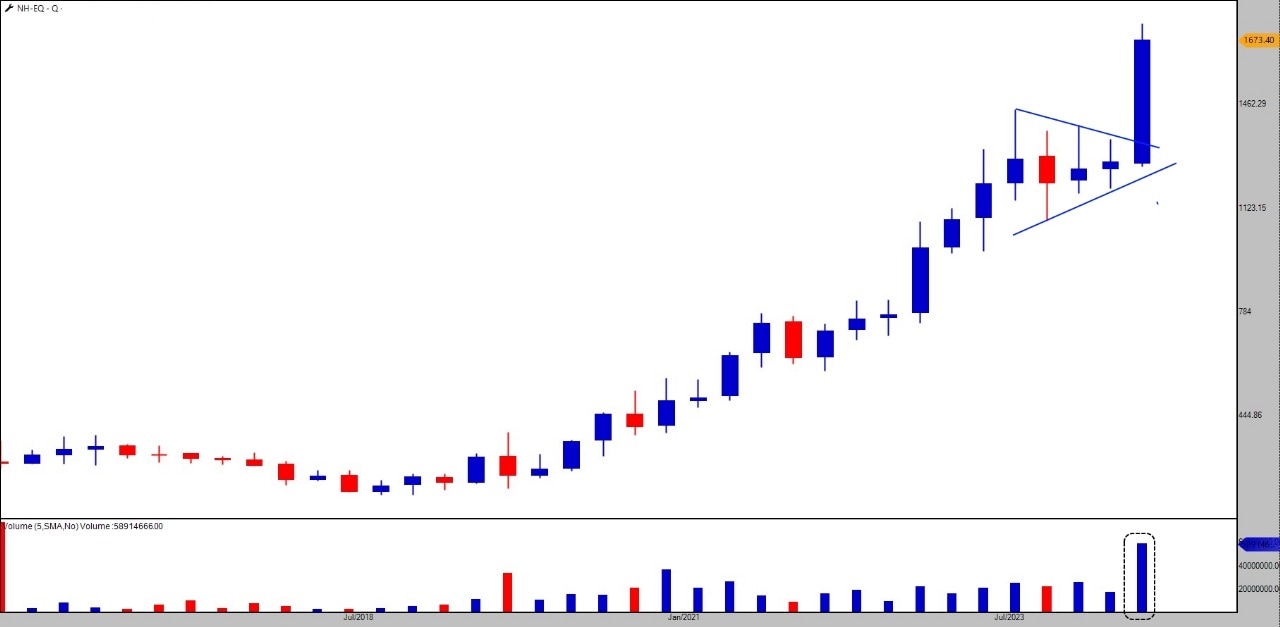 In the current quarter, Narayana Hrudayalaya‘s stock price has increased by 31%, with trading volumes up 641% compared to the previous quarter. The quarterly chart indicates a breakout from a symmetrical triangle pattern, signalling a bullish trend. Investors might consider any price dips as potential entry points.