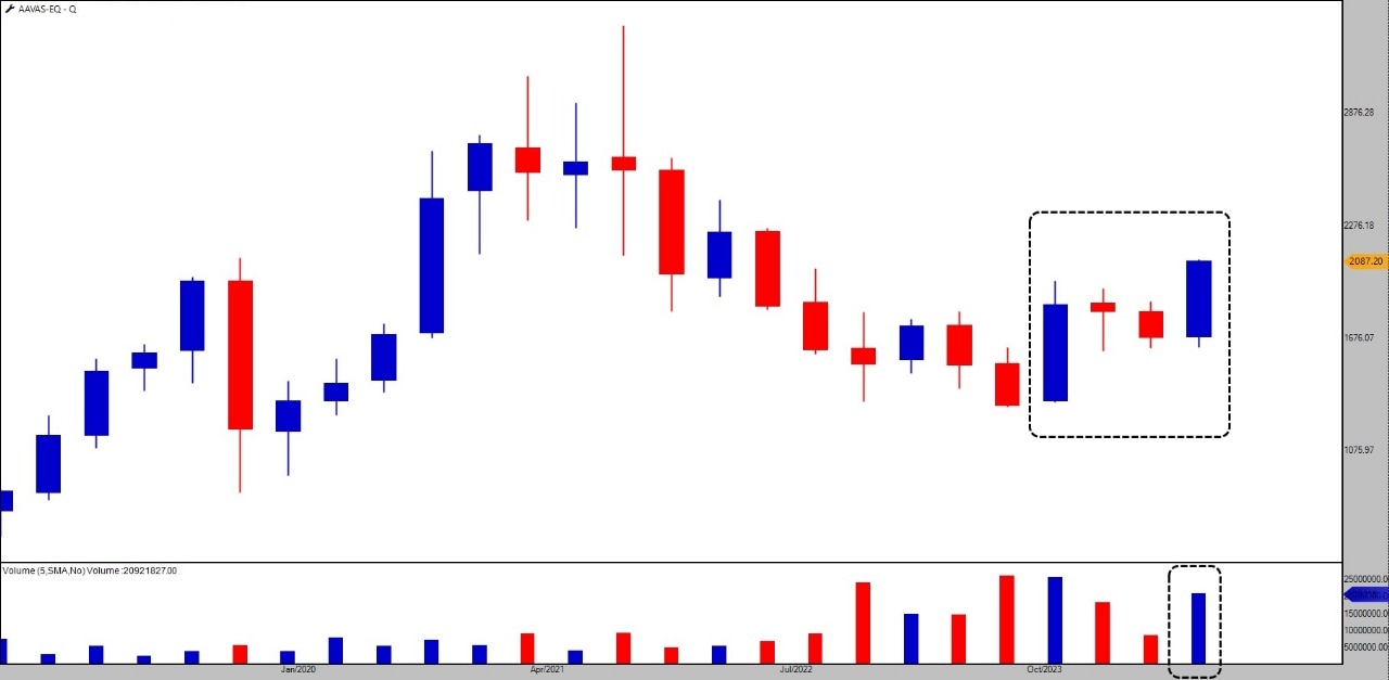 In the current quarter, Aavas Financiers’ stock price has appreciated by 24%, with trading volumes up by 148% compared to the previous quarter. The quarterly chart reveals a “Rising Three Methods” bullish candlestick pattern. This pattern typically indicates a continuation of the prevailing uptrend, suggesting a potential opportunity for investors.