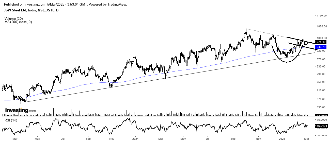 JSW Steel is trading above its 200-day moving average (DMA). It has formed a bullish continuation cup and handle pattern—typically a sign of accumulation and a potential continuation of the previous uptrend. Adding to the bullish setup, the 14-period RSI has moved into the bullish zone, indicating strengthening momentum.