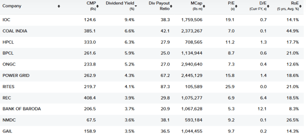 Here’s a table that shows the high dividend yield PSU stocks across various parameters.