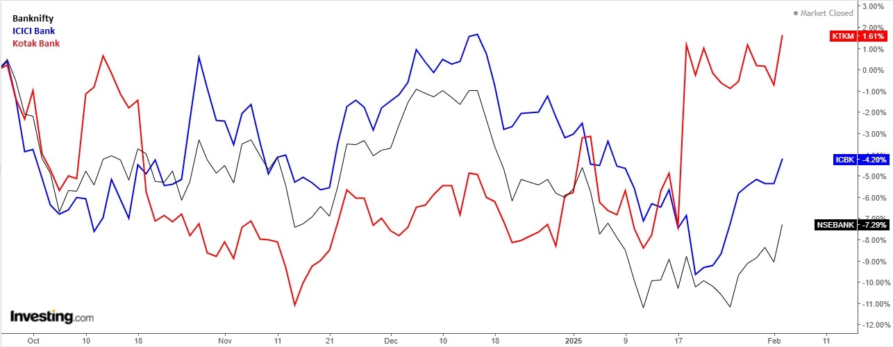 Bank Nifty reached its all-time high of 54,467 in September 2024. Following this peak, the index experienced a correction, dipping to 47,844 in January 2025—a decline of 7.29%. Despite this pullback, Kotak Bank and ICICI Bank showed relative resilience, delivering returns of 1.61% and -4.20%, respectively, during the same period.