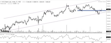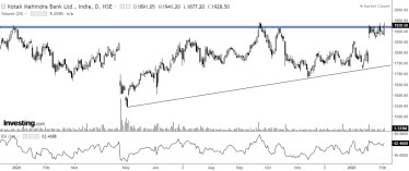 Kotak Bank broke out from its consolidation/ascending triangle pattern at the end of January 2025, retesting the critical resistance level of ₹1,900 for the third time. The stock failed to sustain the breakout in the previous two attempts, pulling back into the triangle pattern. However, the technical setup suggests renewed strength this time as the stock gears up for another breakout attempt.
