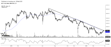 ACC stock generated a strong 57% return from December 2023 to July 2024. However, the past nine months have been challenging, with the stock falling from ₹2,844 to ₹1,778. Recently, technical signals suggest a potential change in momentum. The stock has broken above a key trendline, a classic sign of accumulation and a possible trend reversal. Additionally, the 14-period RSI has entered the bullish zone, indicating improving momentum.