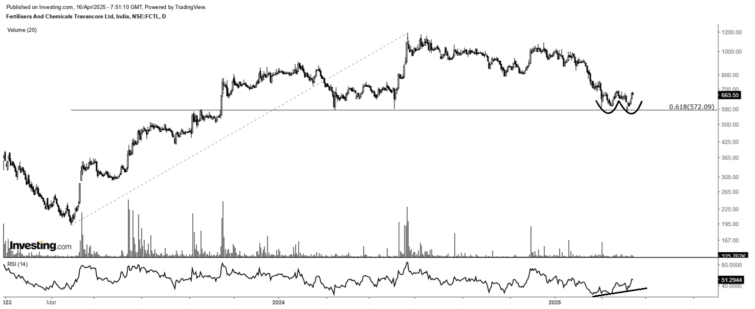 FACT delivered an impressive 494% return from April 2023 to June 2024 but has since entered a corrective phase, with its price dropping from ₹1,187 to ₹565. However, early signs of recovery are emerging. The stock has formed a significant bullish reversal with a double bottom pattern and is currently trading above a key Fibonacci level. Additionally, the 14-period RSI shows bullish divergence, suggesting that FACT may be poised for an upward movement.