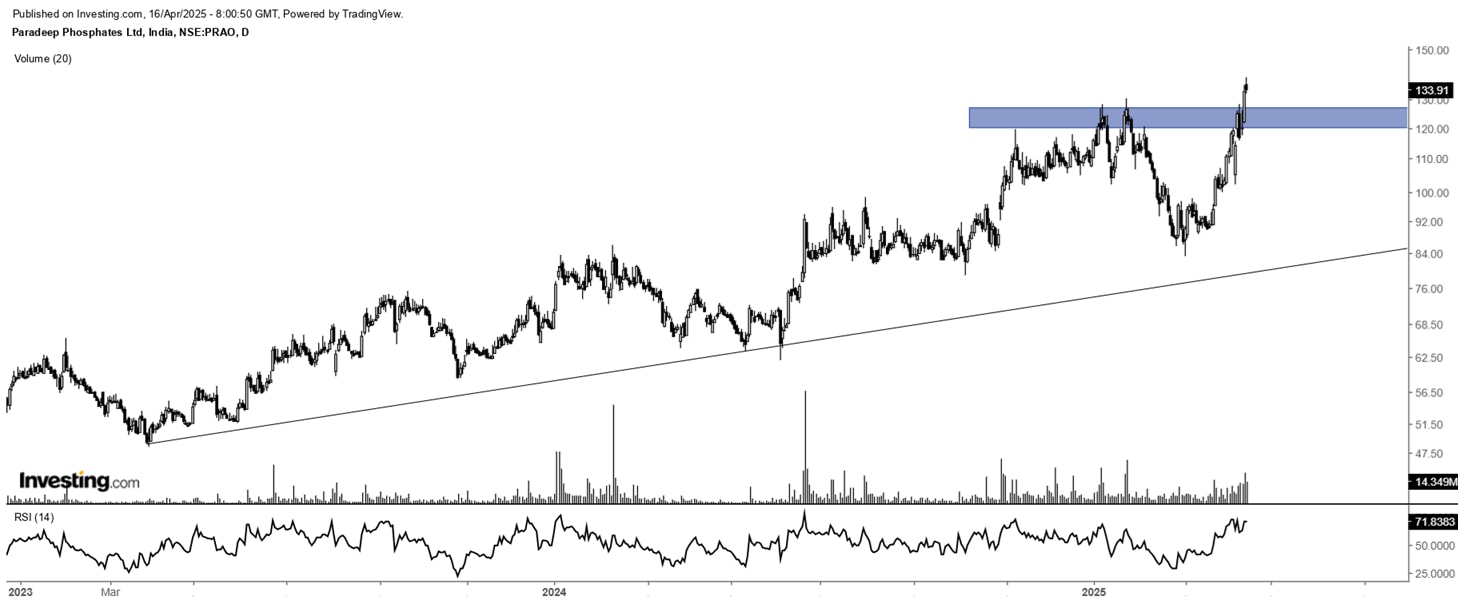 - Round Bottom Breakout: Paradeep has broken out from the classic rounding bottom pattern, reinforcing the potential for the previous trend to continue.