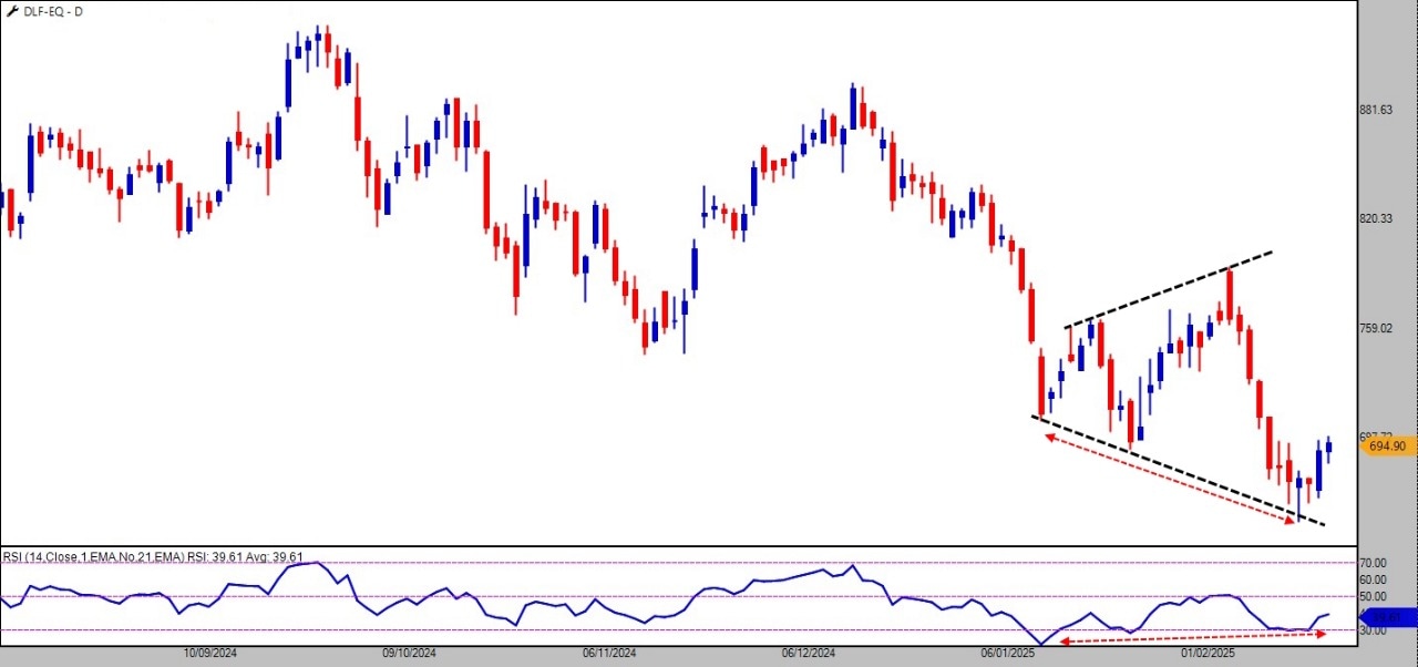 The positive divergence on the Relative Strength Index (RSI) adds further conviction to the reversal. The RSI, at the support level of the Megaphone pattern, is showing a bullish divergence, indicating that the downward momentum is weakening and buyers could start to gain more influence. This signals that the probability of a reversal is high, making DLF a stock worth watching in the coming months.