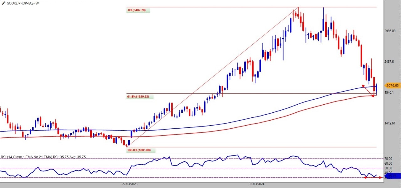 One of the key technical factors supporting a reversal is that the stock is stationed at the 200-week exponential moving average (200WEMA) channel. The 200WEMA is a long-term trend-following indicator that smooths out price fluctuations over time and often acts as a dynamic support or resistance level. In this case, Godrej Properties’ stock price is nearing the lower boundary of the 200WEMA channel, which has historically acted as a key level of support.