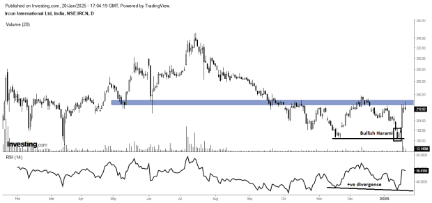 - IRCON: IRCON had a strong start in 2024, but in the year’s second half, the stock corrected from ₹350 after delivering a 72% return from Budget 2024 to Budget 2025. However, its daily chart suggests a renewed bullish trend, supported by the following indicators: