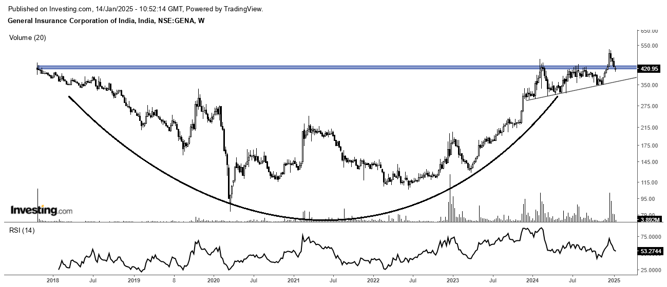 On the weekly chart, GIC Re has broken out of an ascending triangle, a pattern indicative of a bullish continuation.