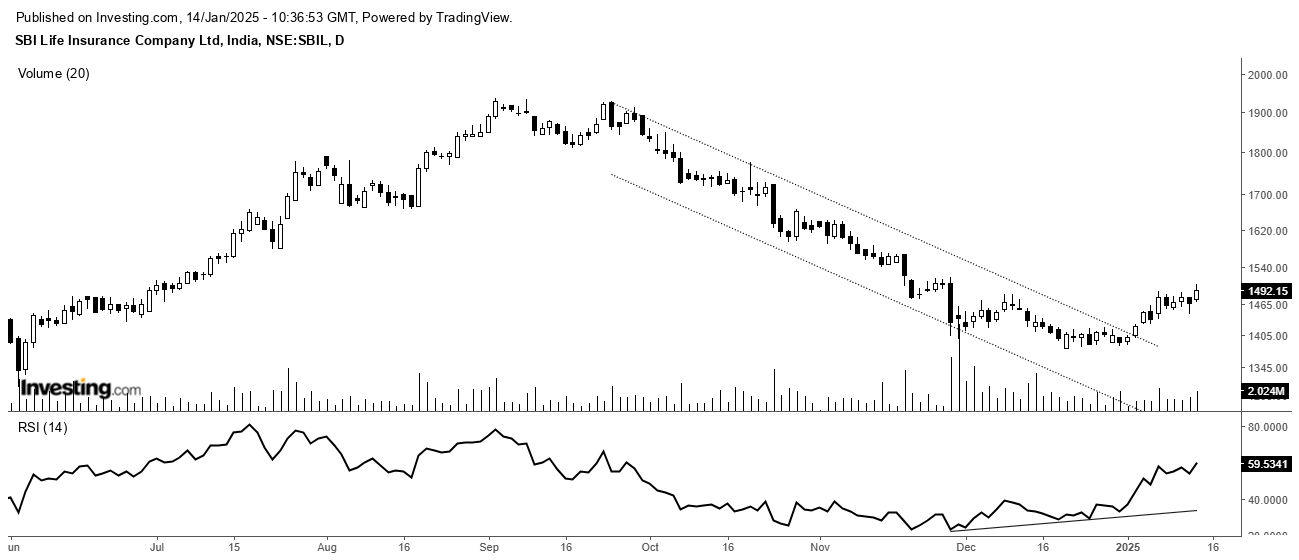 SBI Life has broken out of a falling channel, a classic bullish signal that suggests the end of short-term selling pressure.