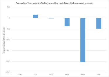 But by the end of FY25, cracks had begun to appear. Despite a multifold expansion in profits, cash-flows were not keeping up. Inventory was piling up, further stressing out the company’s cash-conversion cycle. The order-book was not expanding raising questions on future growth prospects.