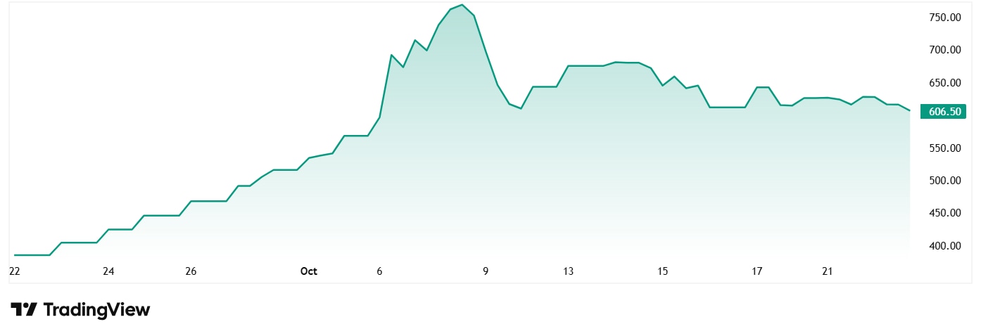 The share price of TechD Cybersecurity Ltd was around Rs 385 on listing in September 2025 and as of 24th October 2025, the price is at Rs 607, which is a 58% jump in just a month.