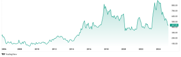The all-time high price of the stock is Rs 844, so the current share price is a 44% discount on its all-time high price.