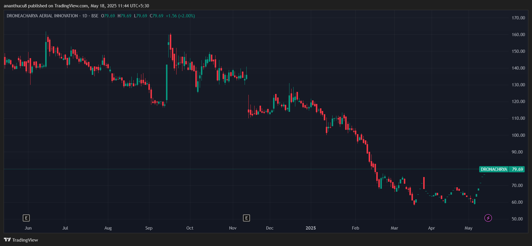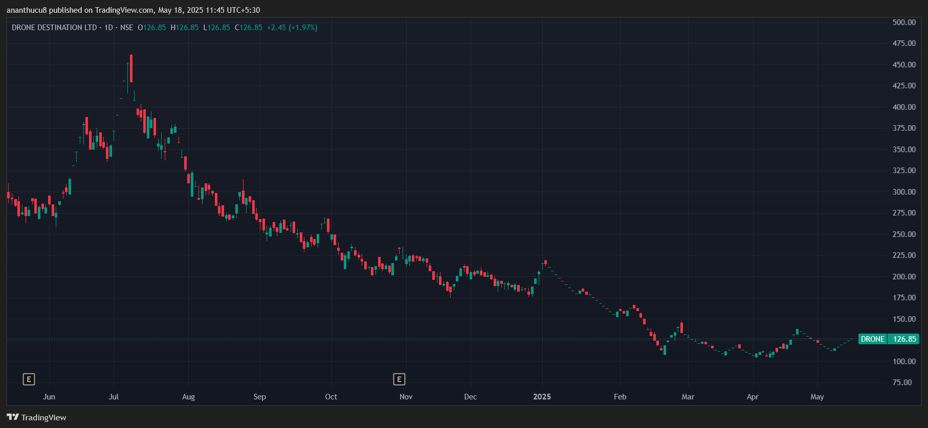 Drone Destination has risen over 10% to Rs 126.85 since May 7. This is in sharp contrast to the 56% decline it has experience over the last year. The company provides training, operation, manufacturing, repair and rentals of drones.