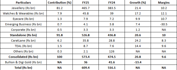 The consolidated jewellery business total income in FY25 increased 21% from last year to Rs 466 billion (bn), driven by 23% value growth due to higher gold prices. However, volume growth slowed.