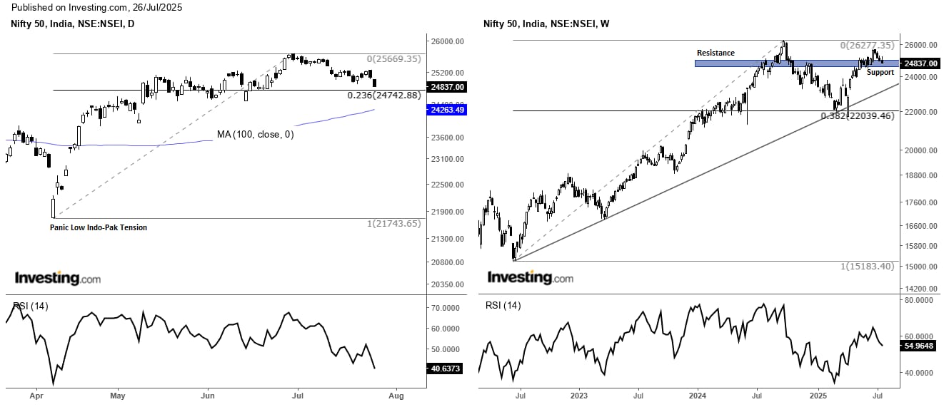 Technically, Nifty 50 broke below its 20 and 50-day moving averages and is currently testing support near the 24,800–24,900 zone. RSI has slipped below 50, indicating weakening momentum.