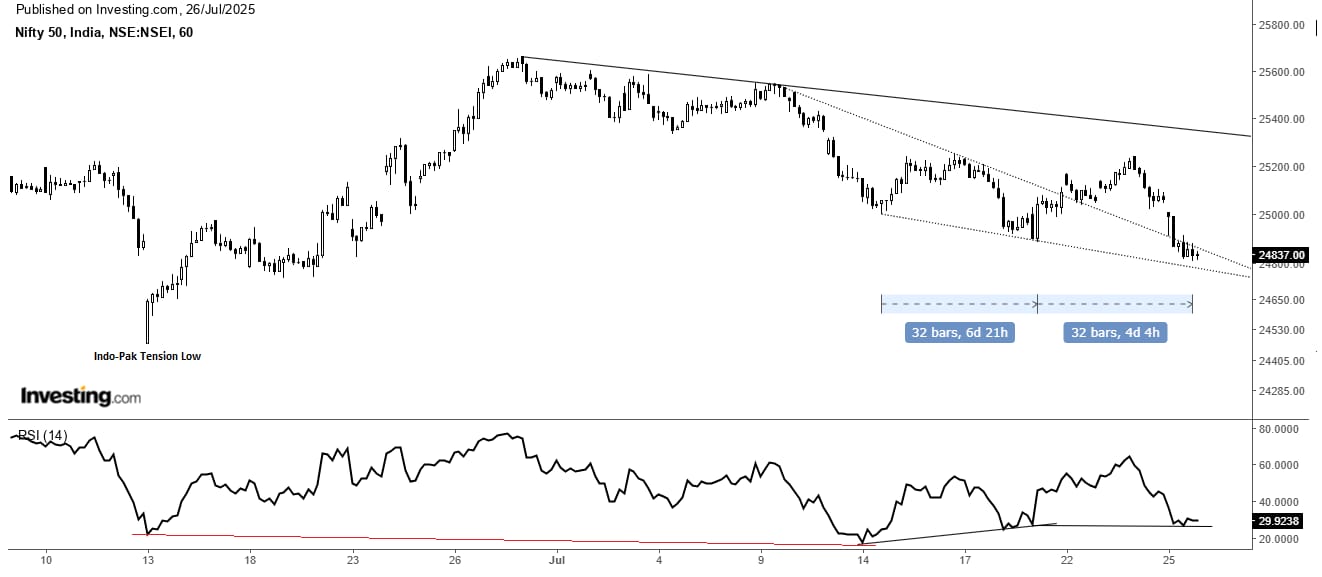 Post the Indo-Pak tension, Nifty rebounded sharply & gained nearly 4.90% in just one month. Currently, the price is retracing & approaching key support near 24,800. On the hourly chart, a falling wedge bullish pattern has formed, which typically signals a potential reversal. The breakout from this wedge was short-lived, but the price is now testing an important trendline.