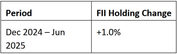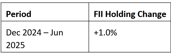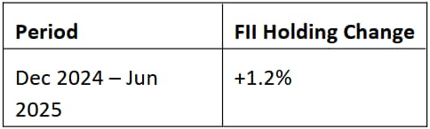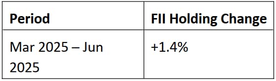 Foreign institutional investors have started taking note. FII holding rose from 3.9% in March 2025 to 5.3% in June 2025.