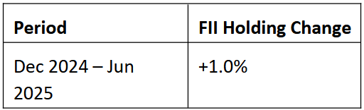 FII ownership in the stock rose by 1% between December 2024 and June 2025.
