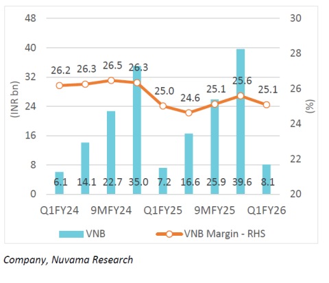 According to Nuvama’s July report, HDFC Life’s value of new business (VNB) margin slid to 25.1% this quarter, compared to 26.5 % in Q4FY25, falling 145 basis points (1.45%). The annualized premium equivalent (APE) fell 37.8% to ₹32.3bn in Q1FY26 compared to ₹51.9 bn in Q4FY25. HDFC Life gave up some of its short-term speed for long-term profitability.