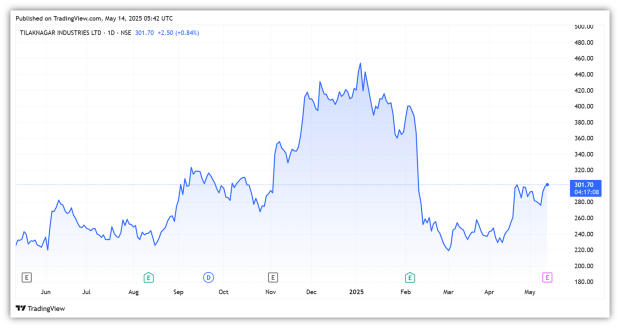 From a valuation perspective, Tilaknagar Industries trades at a PE of 31x, at a discount to a 10-year median of 39x.