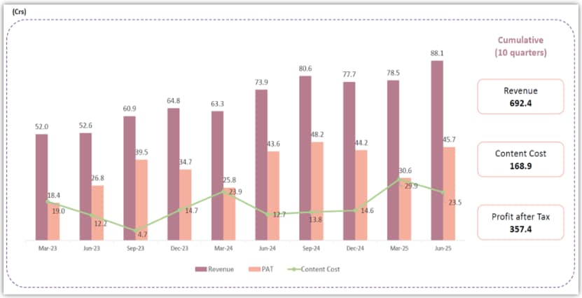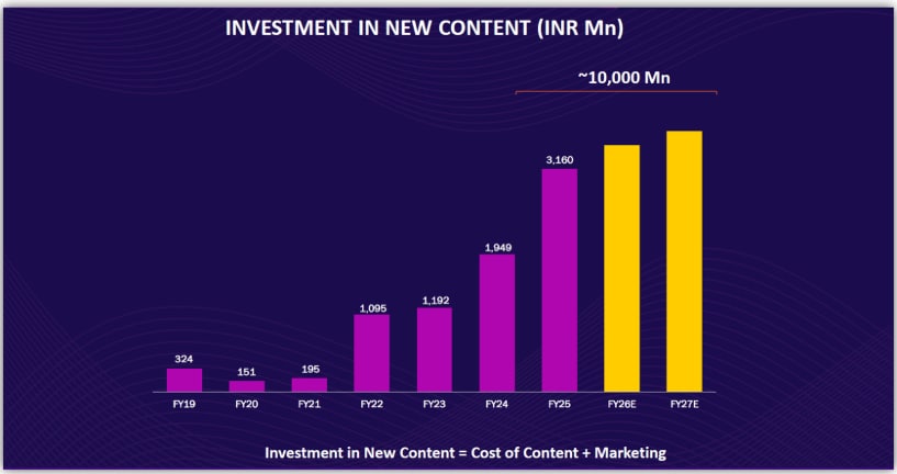 From a financial perspective, the company’s revenue increased 19% year-on-year to ₹881 million. Of this, content costs alone accounted for 73.7% (₹235 million, up 85% from the previous year) of the total cost. This led to a decline in EBITDA by 4% to ₹565 million, while the margin also fell 940 bps to 64.2%, reflecting weaker operating leverage.