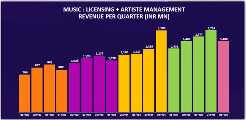 From a financial standpoint, Saregama’s revenue in Q1FY26 increased by just 1% to ₹206.8 crore. Music (licensing and artist management) revenue grew 12% to ₹149 crore, accounting for 72% of the company’s total revenue. This came despite the closure of Airtel Wynk.