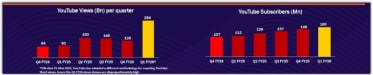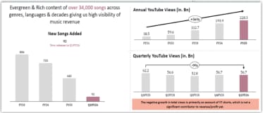 Tips maintains a vast and diverse music library comprising over 34,000 songs across multiple genres and more than 25 languages. The company’s annual YouTube views have increased by about 6 times, from 38.5 billion (FY21) to 228.3 billion in FY25. Its quarterly YouTube views in Q1 FY26 were 56.7 billion, which is somewhat stagnant due to the rapid rise of YouTube Shorts.