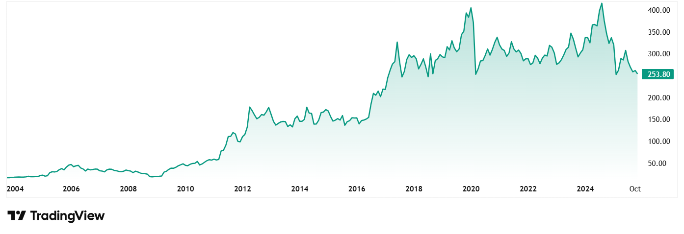 The share price of VST Industries Ltd was around Rs 325 (adjusted for bonus issues) in November 2020 which as on 27th of November 2025 has dropped to Rs 254.