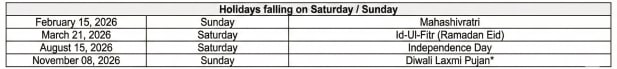 Of the above-listed 15 trading holidays, February 15, March 21, August 15 and November 8 will fall on Saturday and Sunday. On these the festivals of Mahashivrari, Id-ul-fitr, Independence Day, and Diwali Laxmi Pujan will be celebrated.