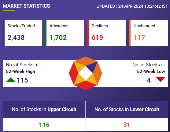 JSW Steel, Tata Steel, Cipla, Hindalco, and Power Grid Corporation were the top gainers in the Nifty 50. While Tata Consumer Products, Infosys, HUL, Tech Mahindra, and Titan were the major losers in the Nifty 50 on April 24.
