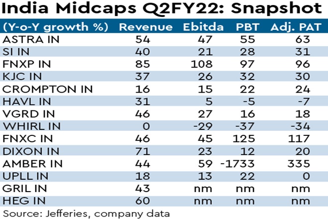 JEF SMID coverage posted healthy sales/PAT growth at +31%/35% y-o-y in Q2FY22. Strong demand from housing upcycle (SI, ASTRA, KJC), traction in Appliances, Electricals (HAVL, CROMPTON, VGRD) and Ebitda turnaround in GRIL, HEG aided growth. Many players have resorted to price hikes to pass-on escalating input costs, which could cushion OPM in Q3. EMS players AMBER, DIXON saw robust sales growth led by indigenisation tailwind & PLI upside.