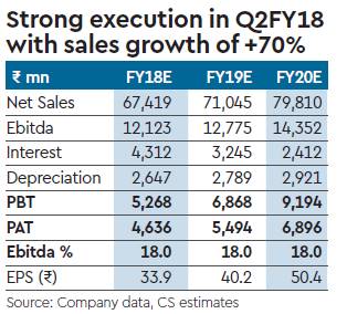 Dilip Buildcon (DBL) posted strong results with 70/80% y-o-y growth in sales/EBITDA. Margins were in line with management’s full-year guidance of 18%. Inflows were negligible. Order book is reasonable at Rs 142 billion, 2.1xFY18E sales. Net debt rose by Rs 2.1 billion q-o-q, driven by working capital (sales growth). Stuck receivables are now Rs 3.0 billion, down Rs 180 million in 2Q. Management revised up FY18E sales guidance to Rs 70 billion. With this strong execution, we highlight that revenue visibility for FY19/20E requires healthy order inflows, which have been missing for DBL to date in FY18E. DBL is targeting Rs 80-100 billion of orders in FY18E (vs Rs 120 billion in FY17). However, we build Rs 70 billion of inflows, given muted activity so far in both roads and mining.