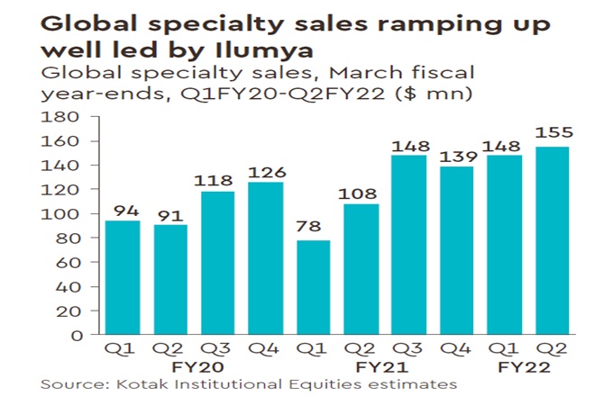 SUNP’s Q2FY22 revenue, Ebitda and profit were 2%, 12% and 22% ahead of our estimates led by strong performance in India and continued specialty scale-up. The domestic business reported strong 26% y-o-y growth (15% two-year CAGR excluding Covid benefits). Specialty ramp-up remains on track with continuing traction in Ilumya/Cequa. We expect ramp-up in the specialty segment to continue over FY2022-23e, driving strong earnings growth. We increase our earnings estimates by 6% each over FY2022-24e. Add with revised FV of Rs 915.