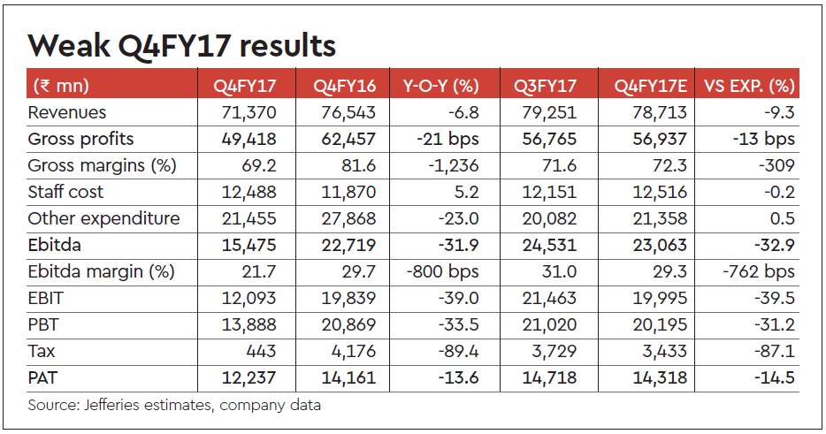 Sun reported weak Q4FY17 results with revenues declining 7% y-o-y, 9% below JEFe, and margins declining 380 bps y-o-y, 340 bps below JEFe. The key disappointment was in the US business led by Taro and increased pricing pressure in base business. There were some one-off impacts, too, in the quarter —inventory write-off, lower exclusivity sales and order supply delays.