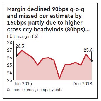 We cut EPS estimates by 3% over FY19-21e mainly to reflect lower margins as we now build in 25.5-25.7% Ebit margin vs. 26.3-26.5% earlier, slightly below management target of 26-28%. Our price target reduces slightly to Rs 2,230 as a result.