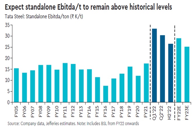 India margins to hold well above past years: We expect TATA’s standalone margins to contract from Q2 level on higher coking coal cost and our expectation of a steel price fall in CY22. We still expect standalone EBITDA/t of Rs 26K/25K in H2FY22/FY23, well above the FY05-21 peak of Rs 18K/t (Q2: Rs 30K/t). For TSE, our estimates factor in EBITDA/t of $180/75 in H2FY22/FY23 (H1: $147). We expect deleveraging to pick up pace in H2; we factor in net debt falling Rs 83/sh in H2FY22 and a further Rs 178/sh in FY23.